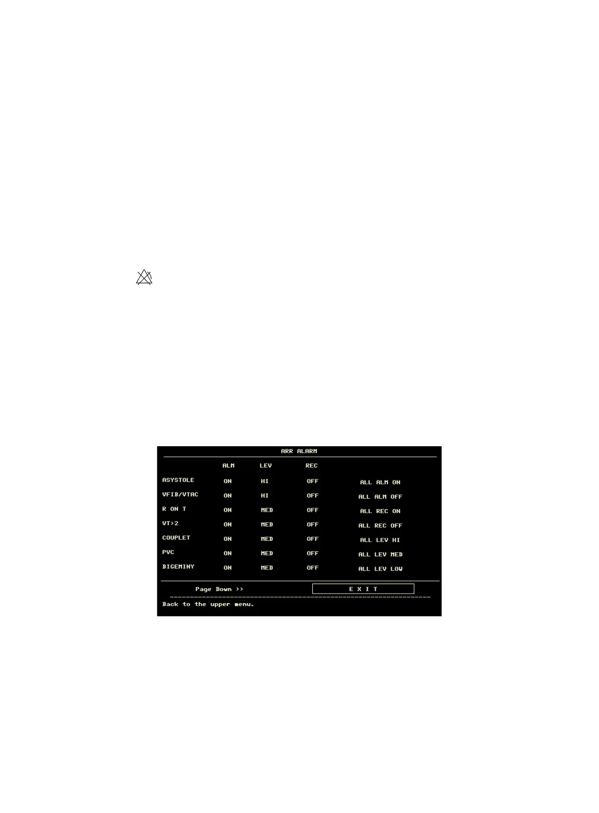 n ARR ALM SETUP: per impostare l'allarme da aritmia. In questo menù, "ALM" è l'interruttore dell’allarme,