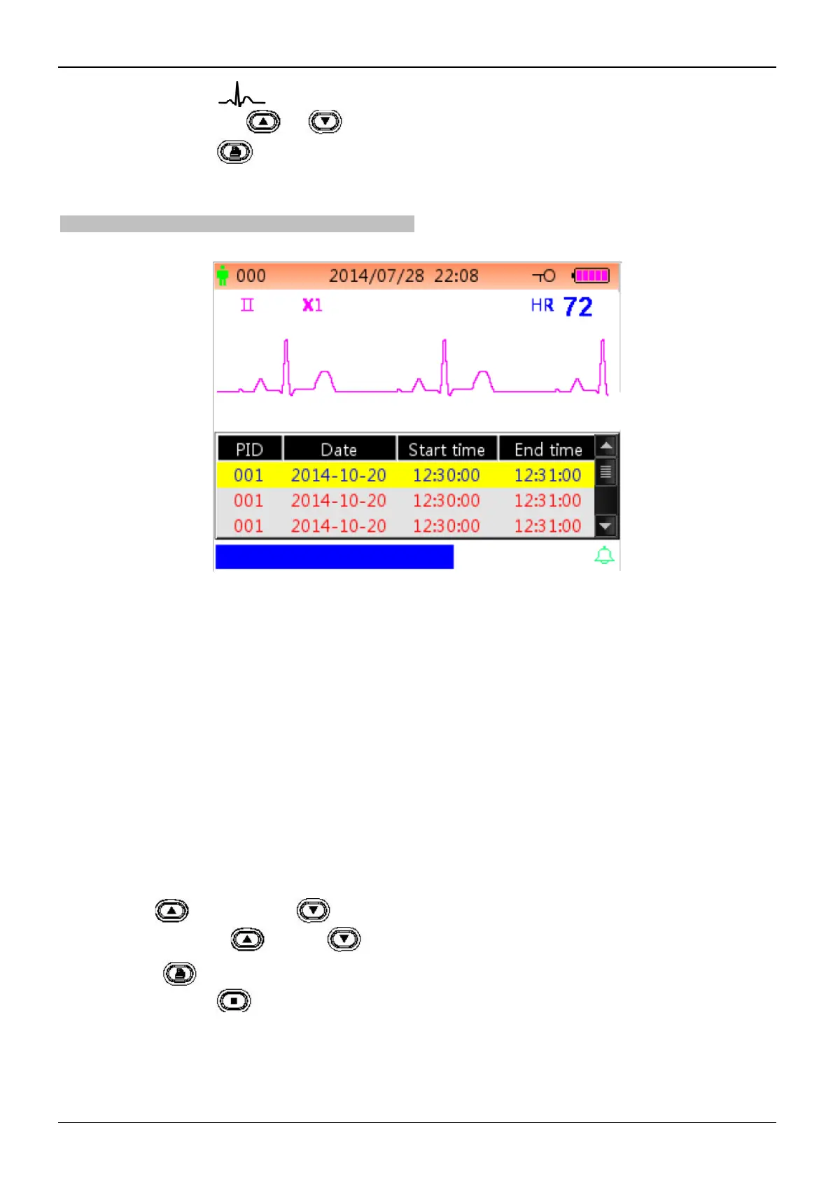 Ø Press Up “ ” key or Down “ ” key to select one ECG record, then press OK key to recall the selected