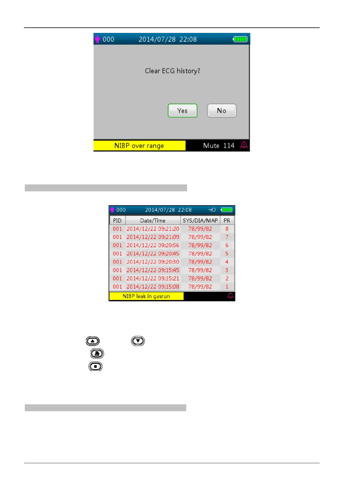 Ø Short press the Up " " or Down " " key to turn to previous or next page for view other NIBP records.