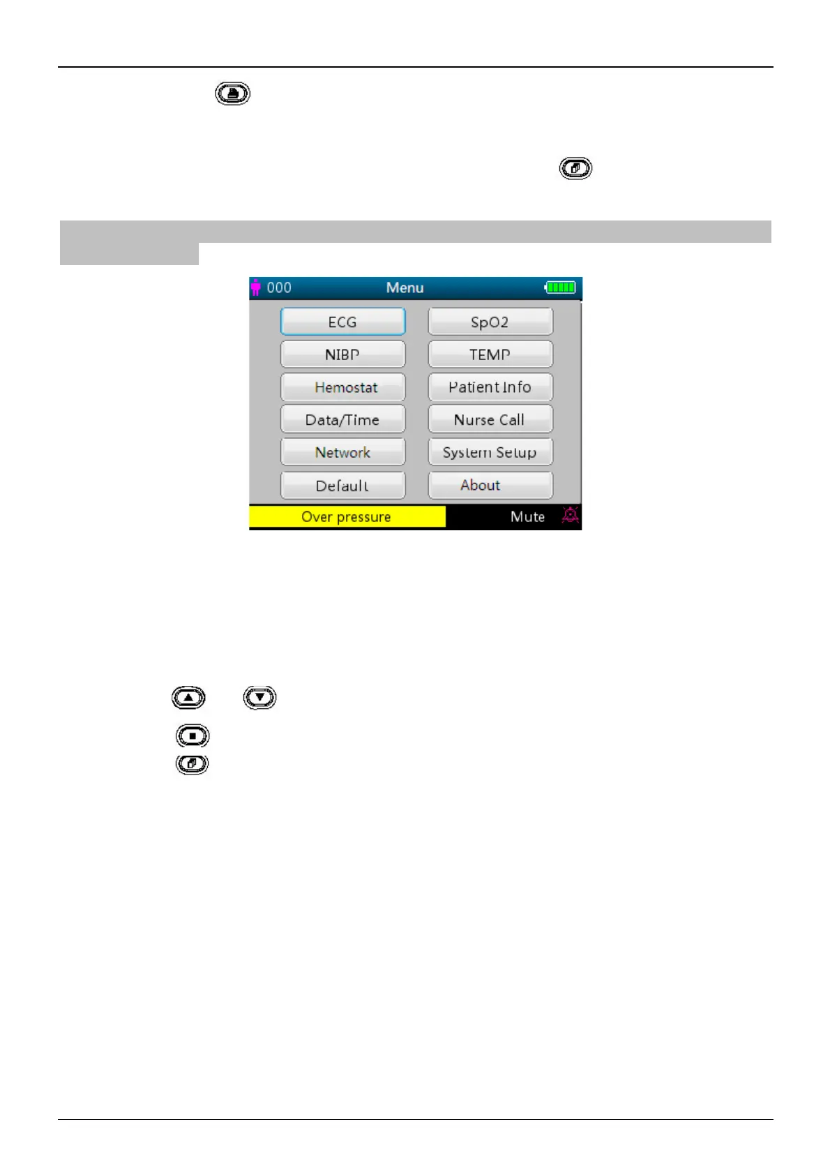 Date/Time, Nurse Call, Network, System Setup, Default and About” on the Setup Menu Screen depending on the