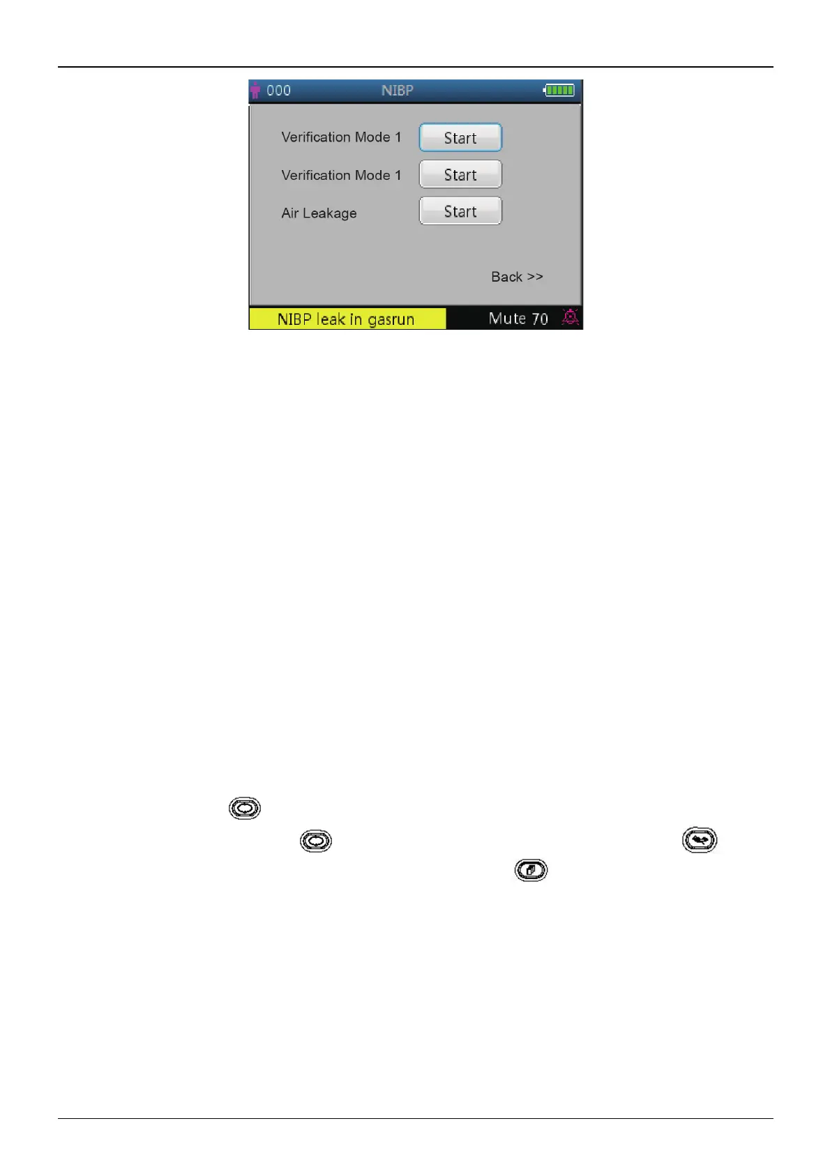 ² "Verification mode 1": Pressure is generated automatically by the internal pump. Move the cursor to NIBP