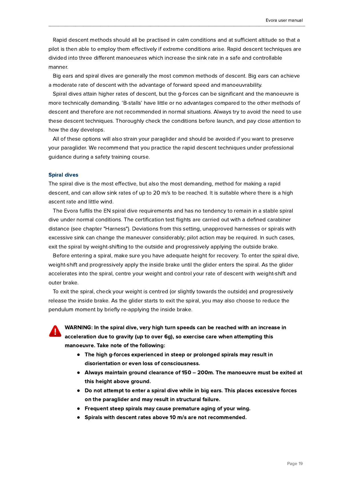 Spirals with descent rates above 10 m/s are not recommended.