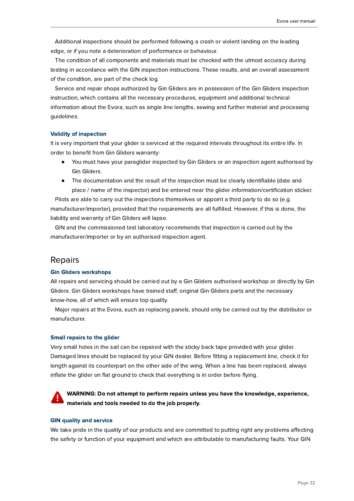 All repairs and servicing should be carried out by a Gin Gliders authorised workshop or directly by Gin