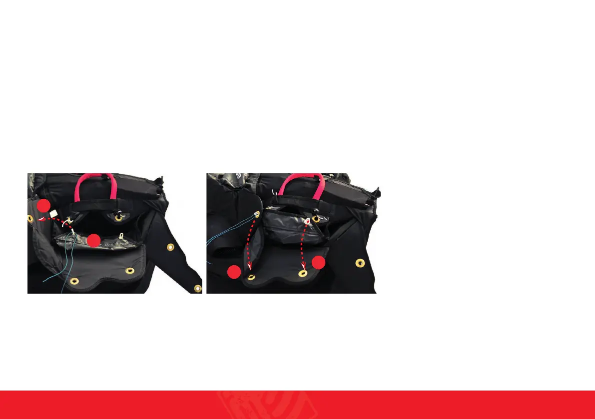by placing the release pins through the elastic loops as shown. Insert each side of the rescue