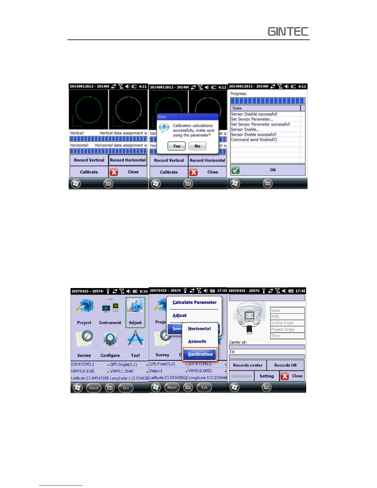 “Declination Calibration”. Click “Adjust—Sensor Calibrate—Declination” to enter the