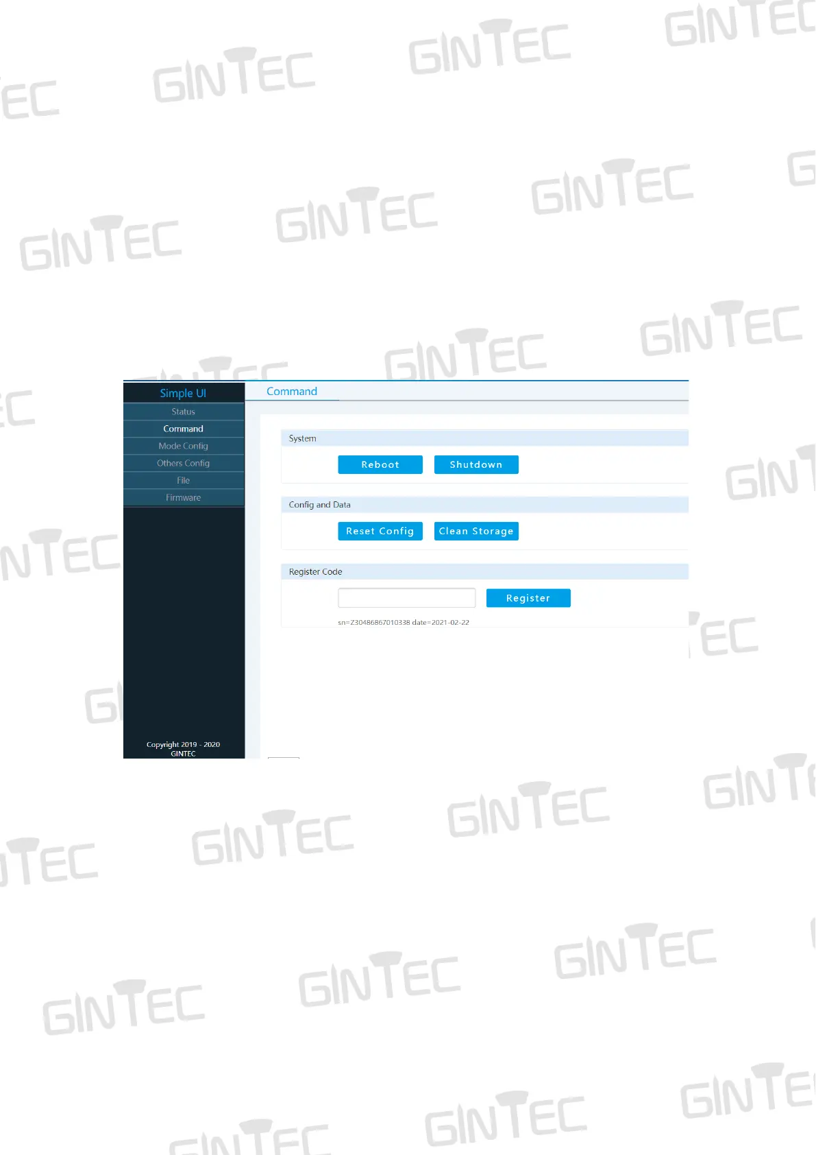 In “Command” you can reboot/shutdown G20M, reset config (Reset factory settings),
