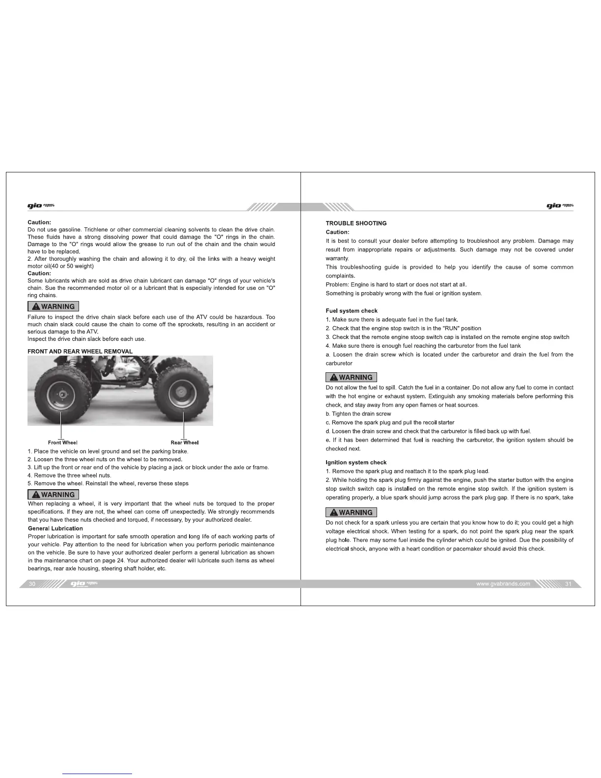 gio Blazer 125 - WHEEL REMOVAL AND GENERAL LUBRICATION; TROUBLESHOOTING GUIDE; FUEL AND IGNITION SYSTEM CHECKS