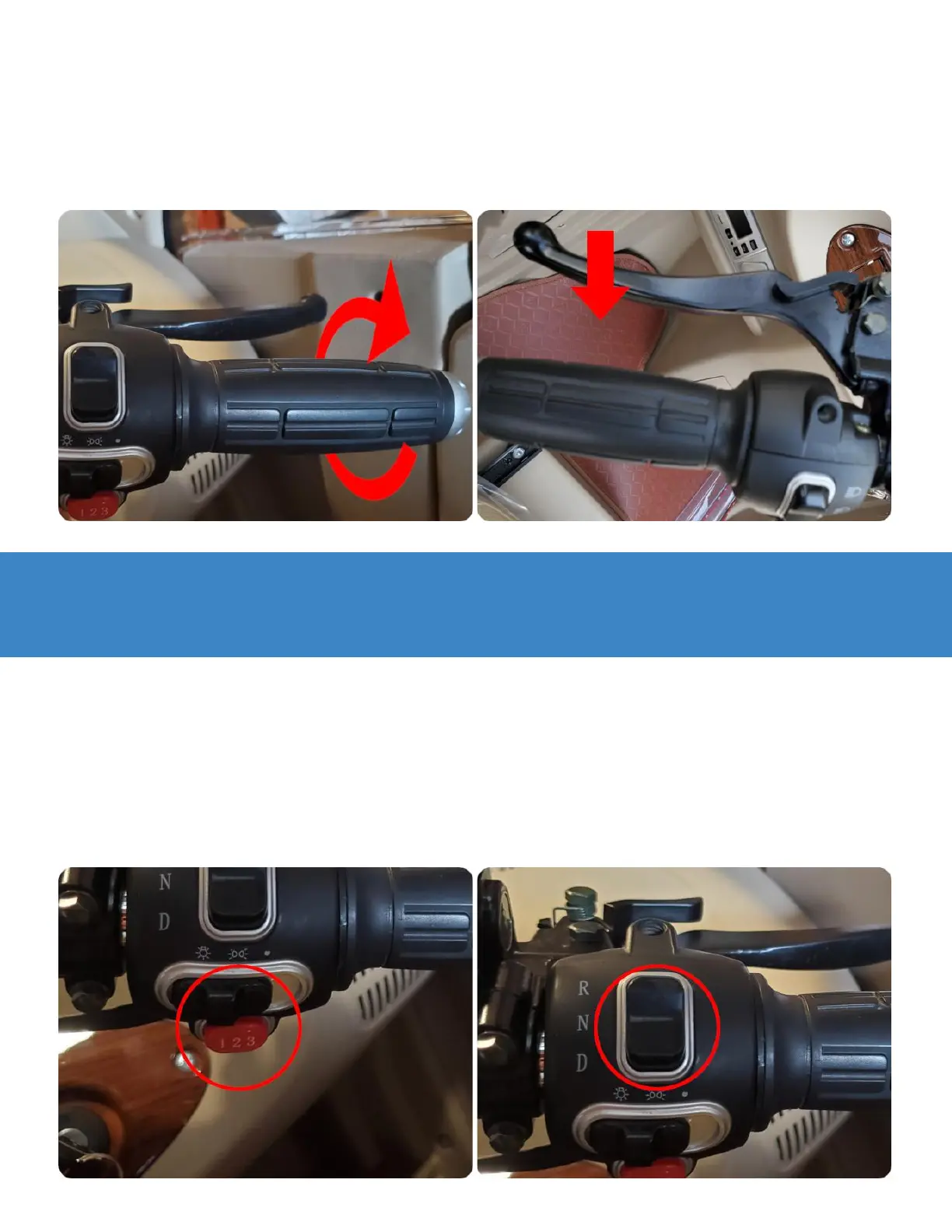 To slow/stop the scooter, release the throttle and squeeze brake levers.