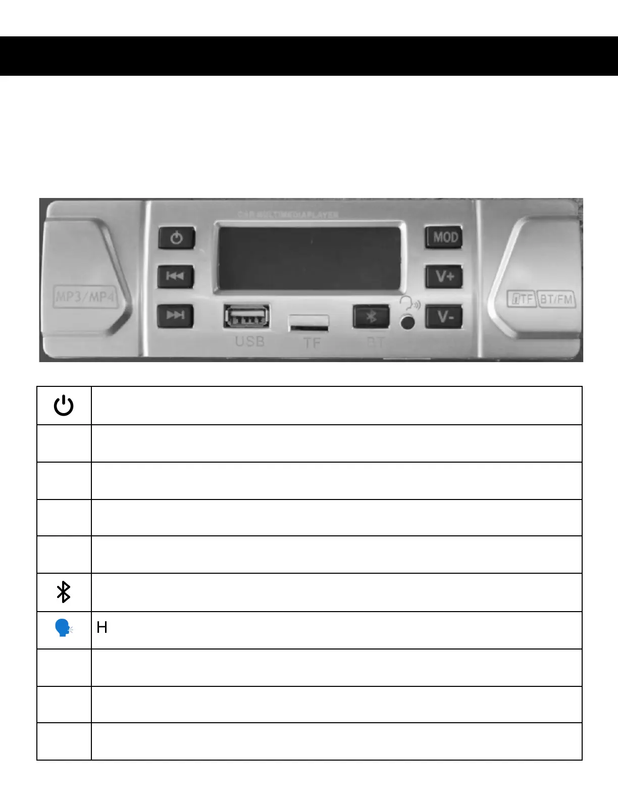 Cycles through modes FM Radio, MP3, MP4, Bluetooth