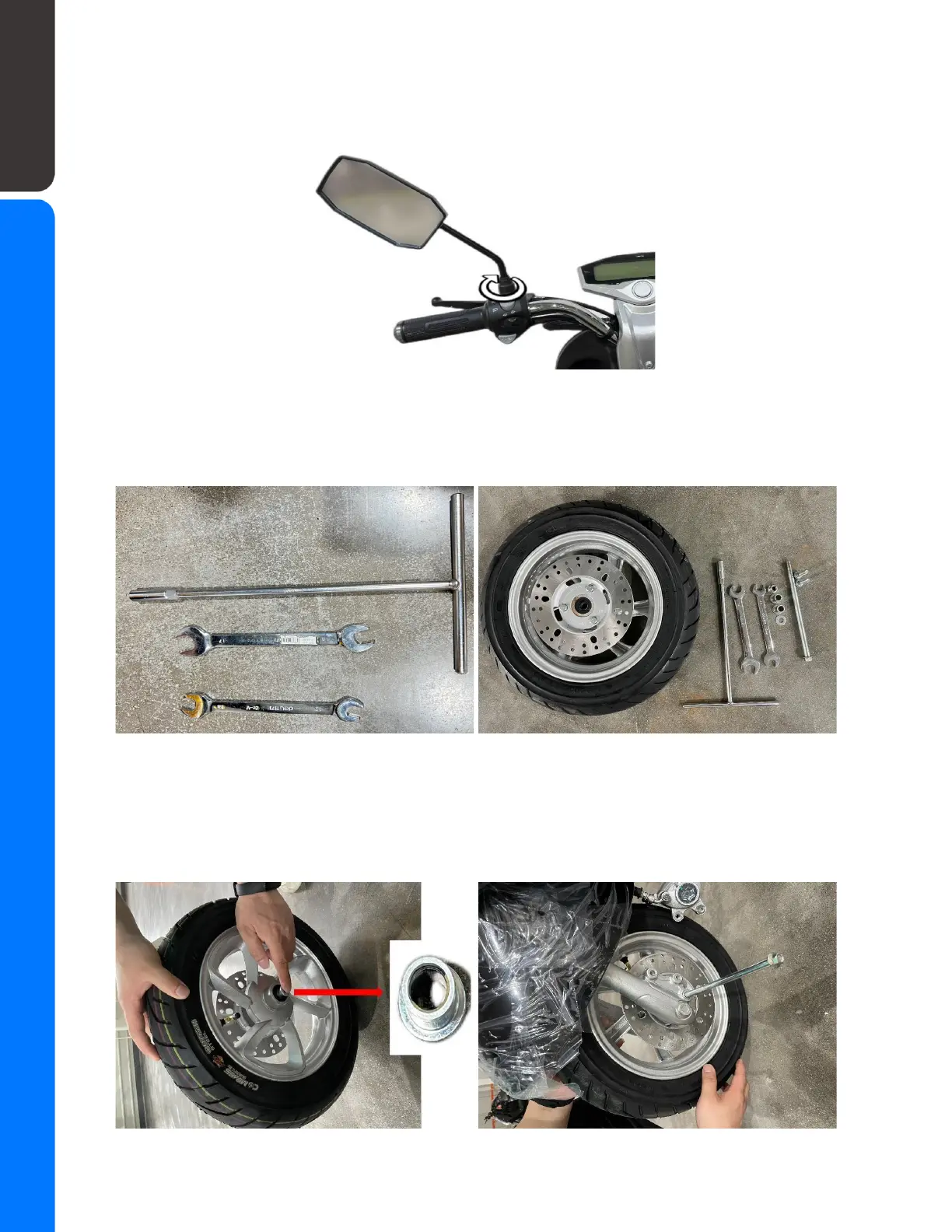 Install the bushing on the front wheel hole with the big head facing outward and the