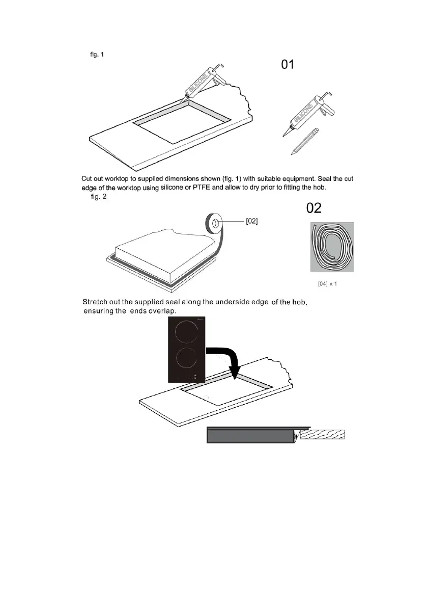 Découpez le plan de travail aux dimensions indiquées (fig.1) avec l'équipement approprié. Scellez le