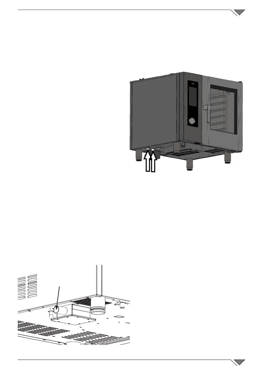 The oven has a water drain; it is placed at the lower rear part of the appliance