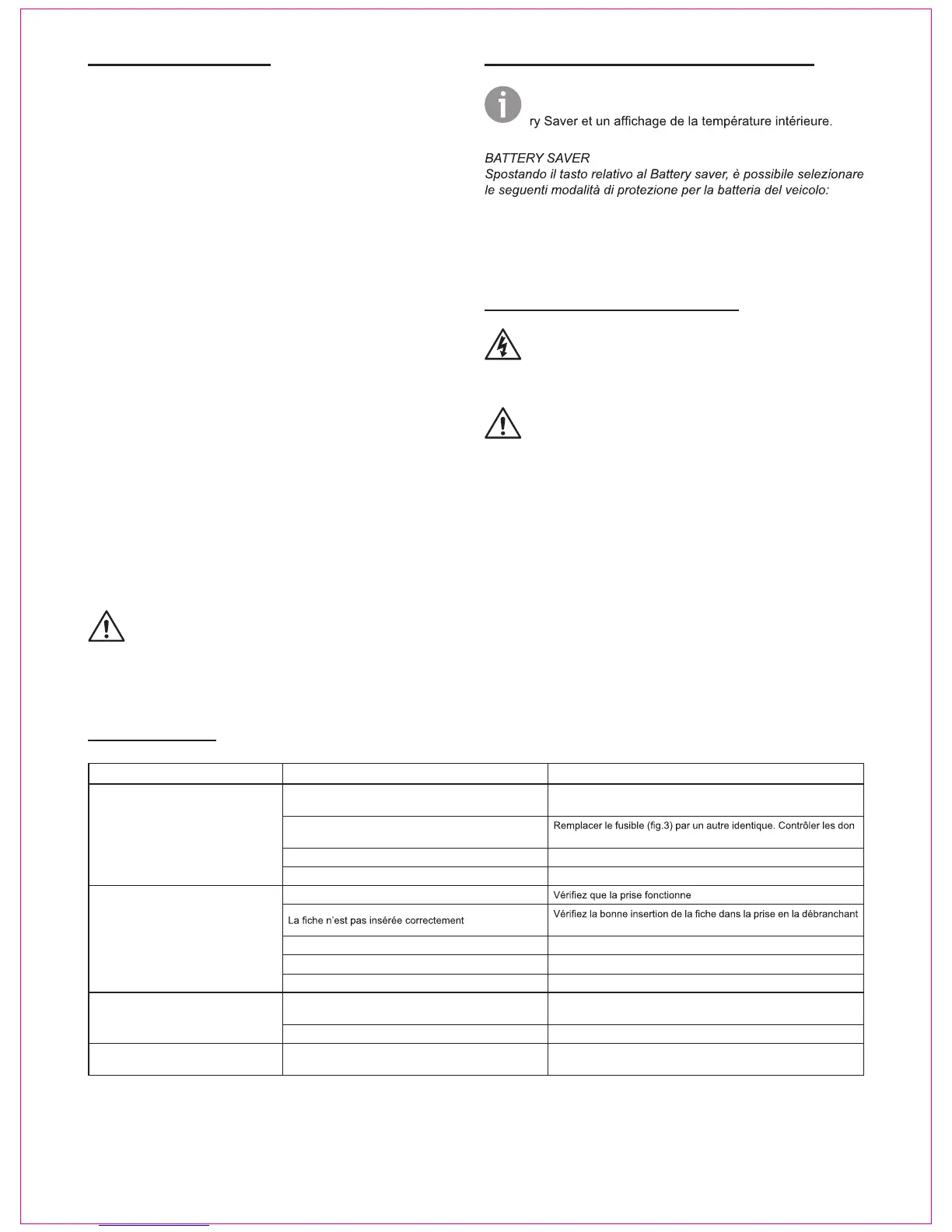 1) Aucune protection de la batterie du véhicule (ATTENTION: ce