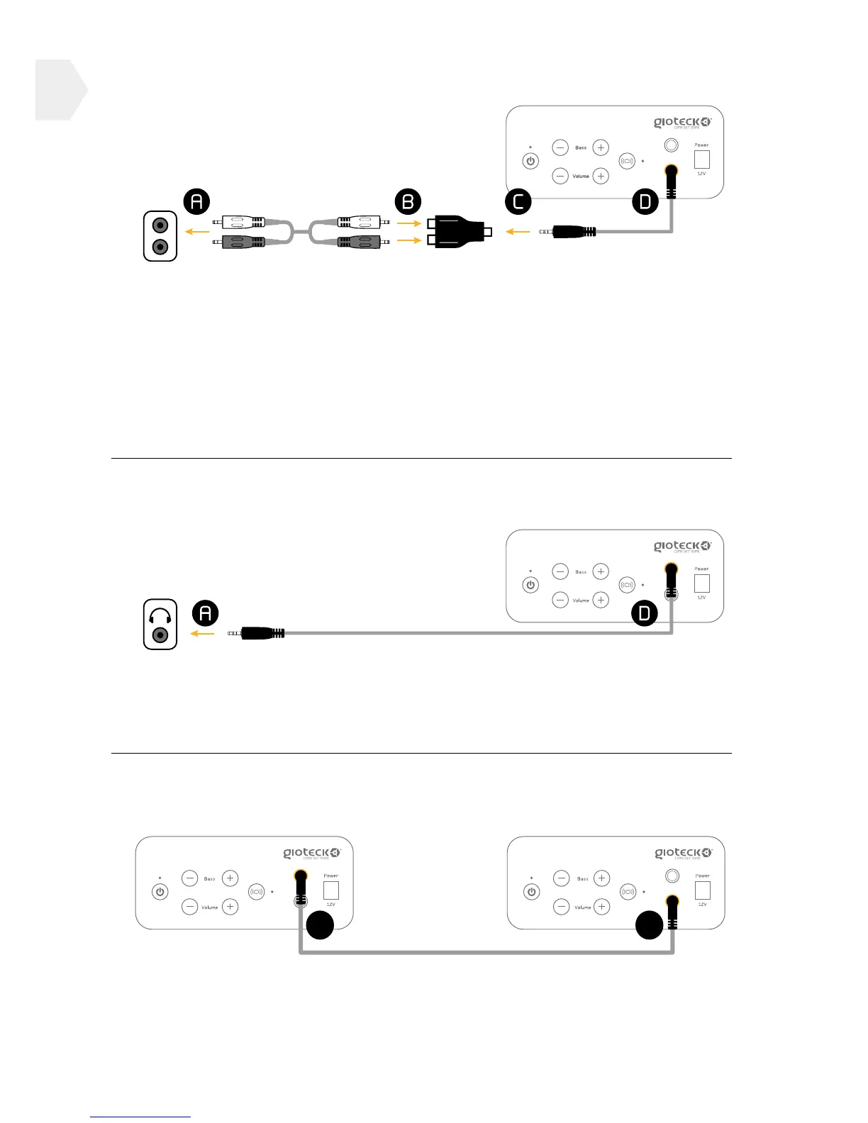 3] Connect one end of the mini audio cable into the RCA adapter (C) and