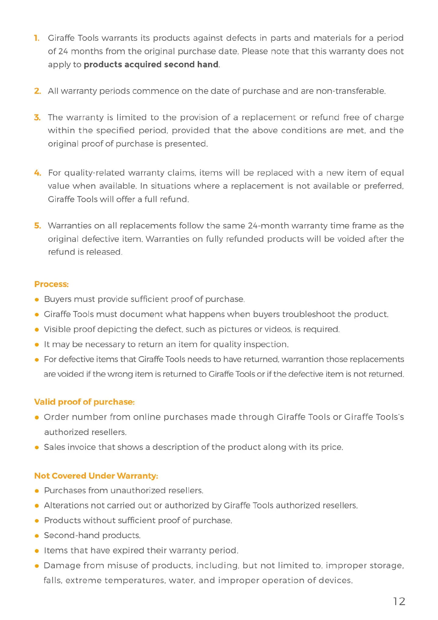 Giraffe AW30 - Warranty Coverage Details; Warranty Claim Process; Valid Proof of Purchase; Not Covered Under Warranty