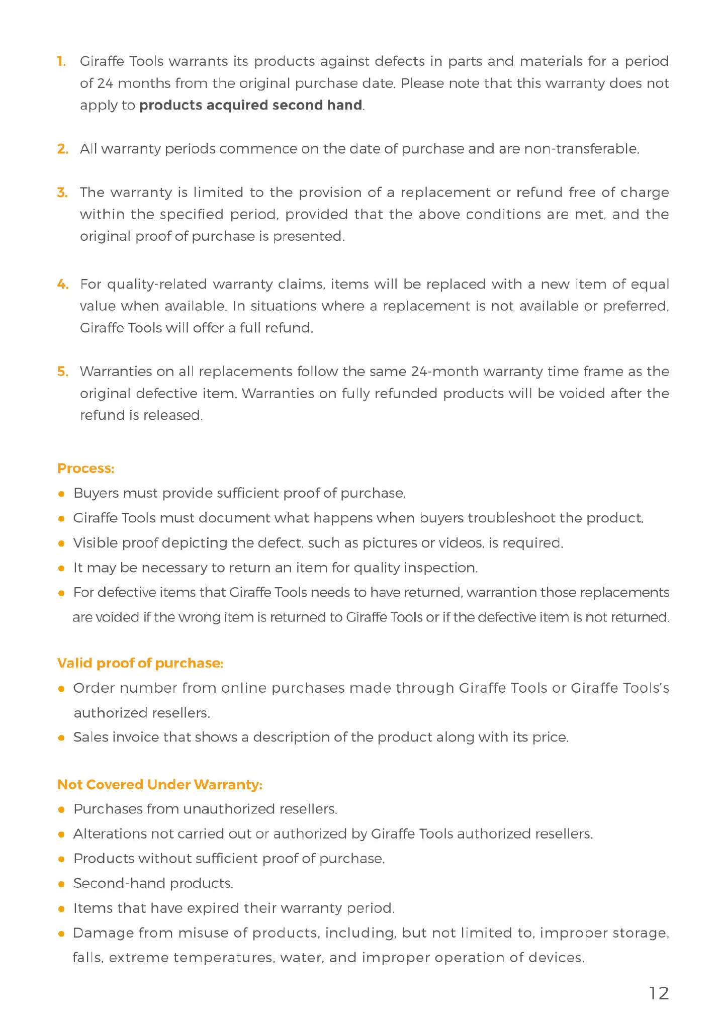 Giraffe AW50 - Warranty Details and Coverage; Warranty Coverage Period; Warranty Process; Valid Proof of Purchase