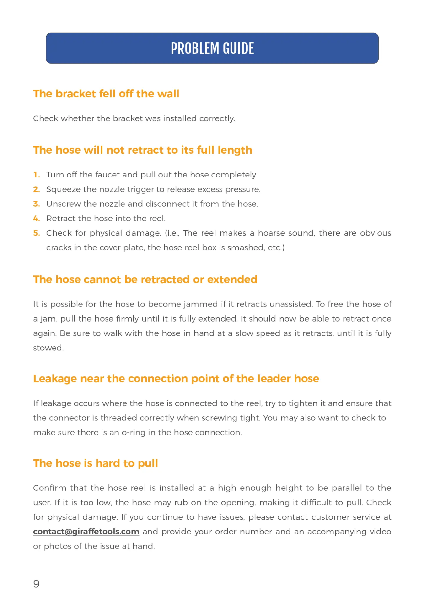 Giraffe AW50 - Problem Guide; The bracket fell off the wall; The hose will not retract to its full length; The hose cannot be retracted or extended