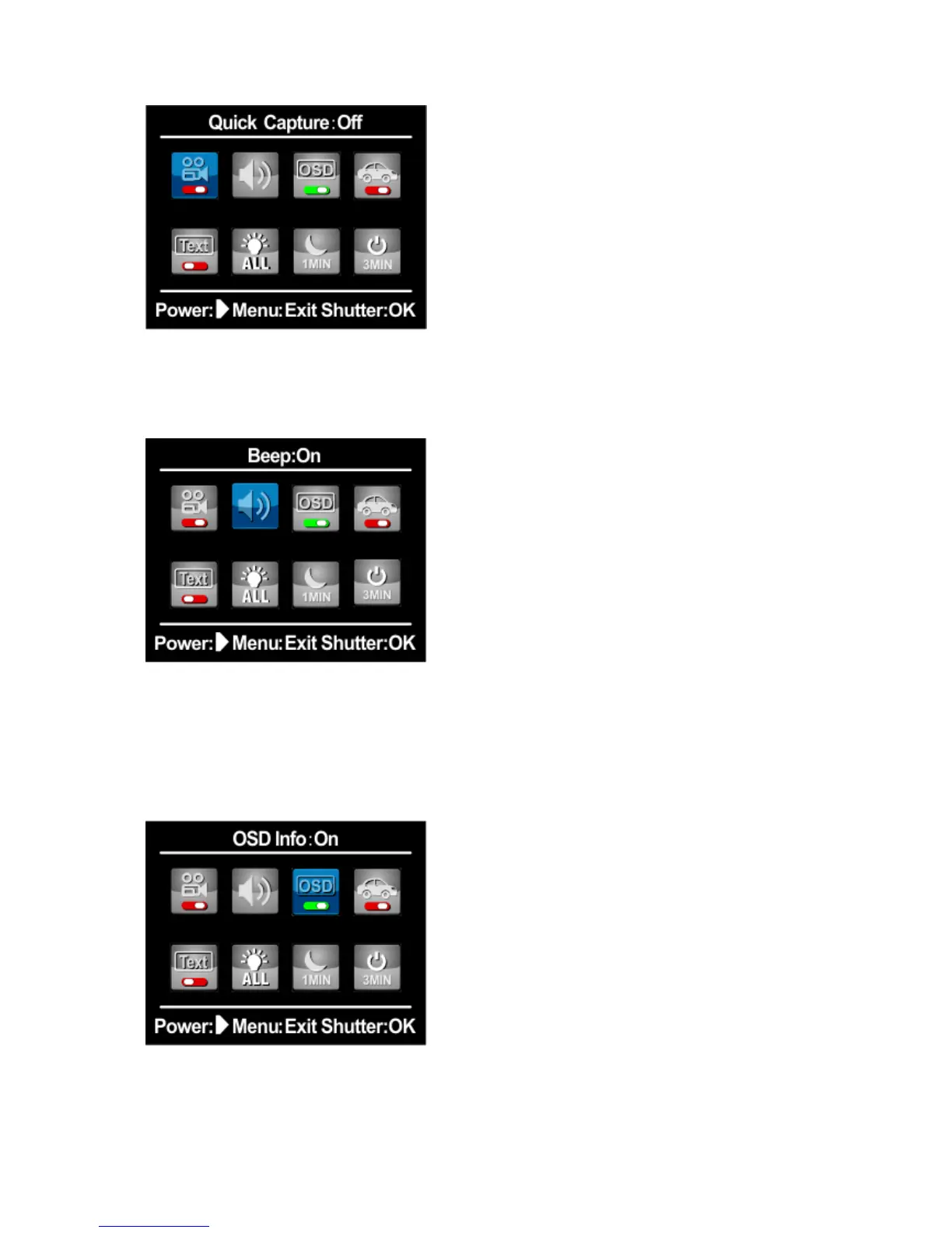 The OSD(on-screen display) setting determines whether the recording icons and file information