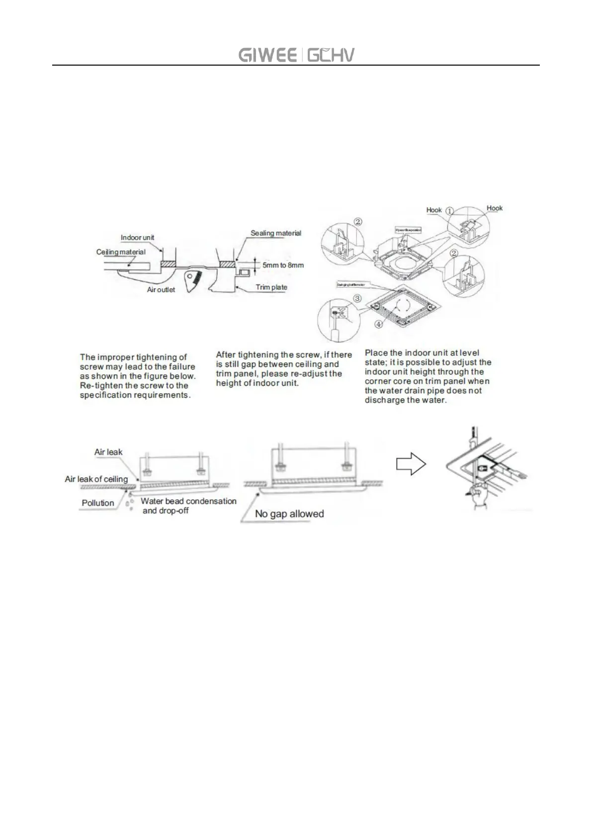 Please adjust the hoisting height of indoor unit to make the dimensions of indoor unit under the ceiling