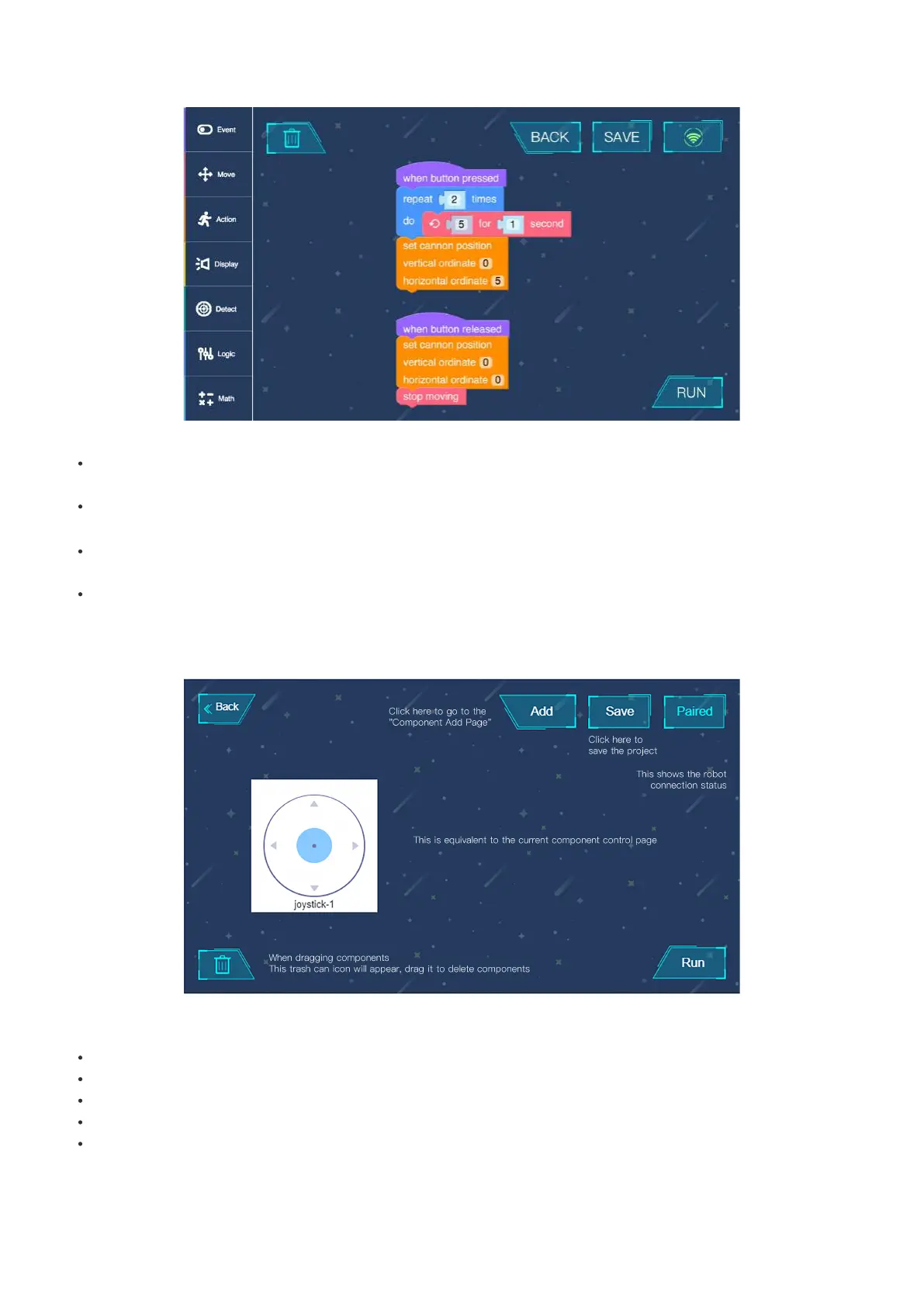 Tapping Save will save your project.Tapping RUN in the bottom-right corner will run the code,