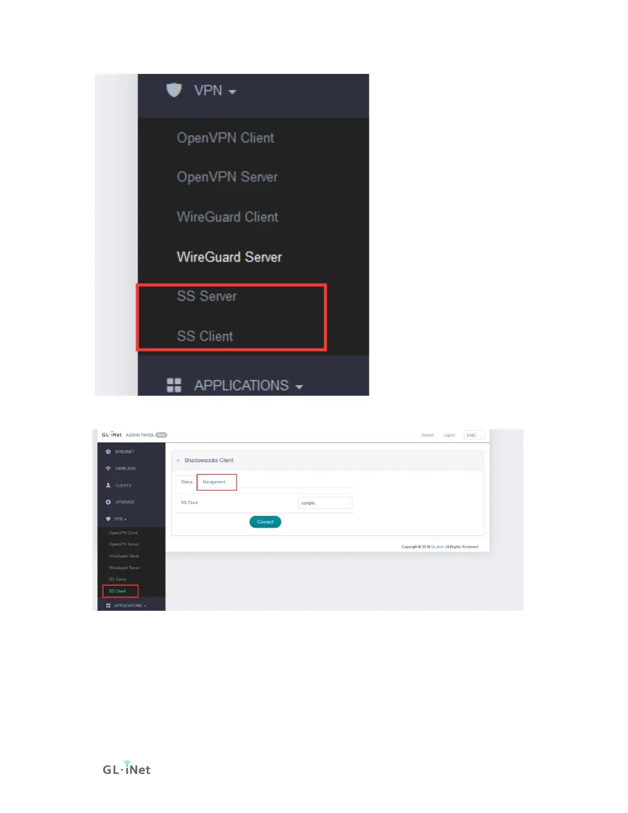 Click "Management" tab to setup SS-Client for GL-AR750s