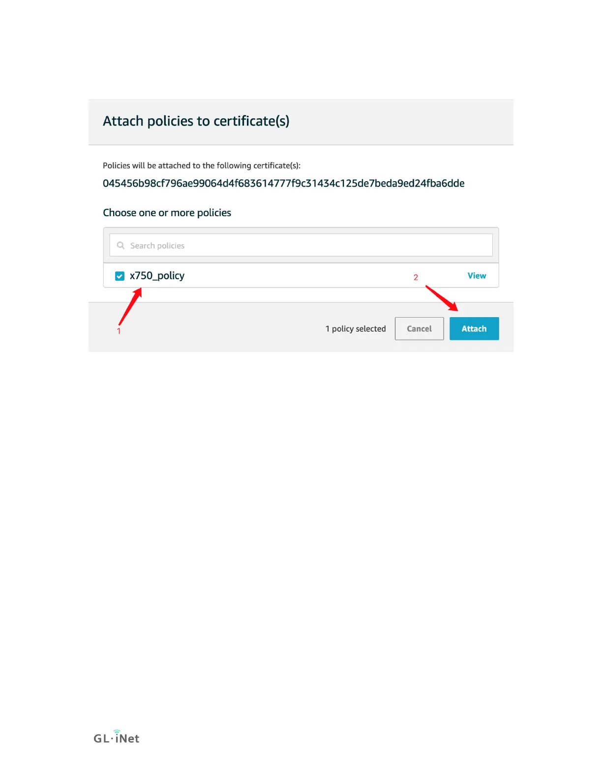6) Chose the policy you created(x750_policy) and choose Attach.
