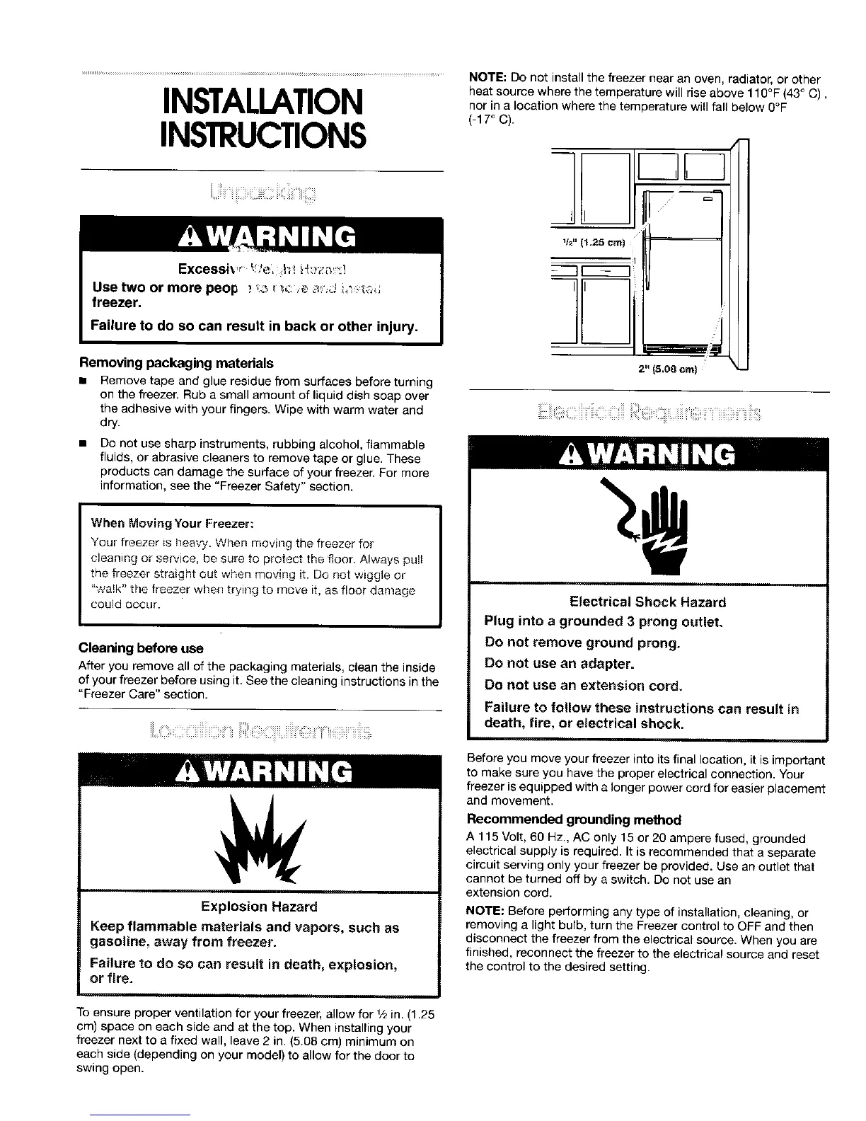 freezer next to a fixed wall, leave 2 in. (5.08 cm) minimum on