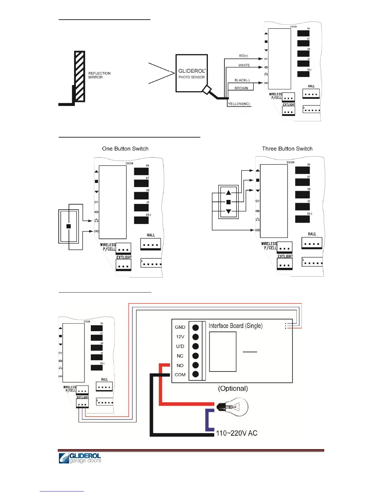 Gliderol Glidermatic GTS+ - Photo Sensor Connection Diagram; External Wall Switch Connection Diagram; External Light Connection Diagram