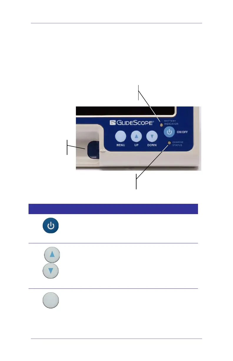 MENU, UP, DOWN, and ON/OFF. Button functions are described