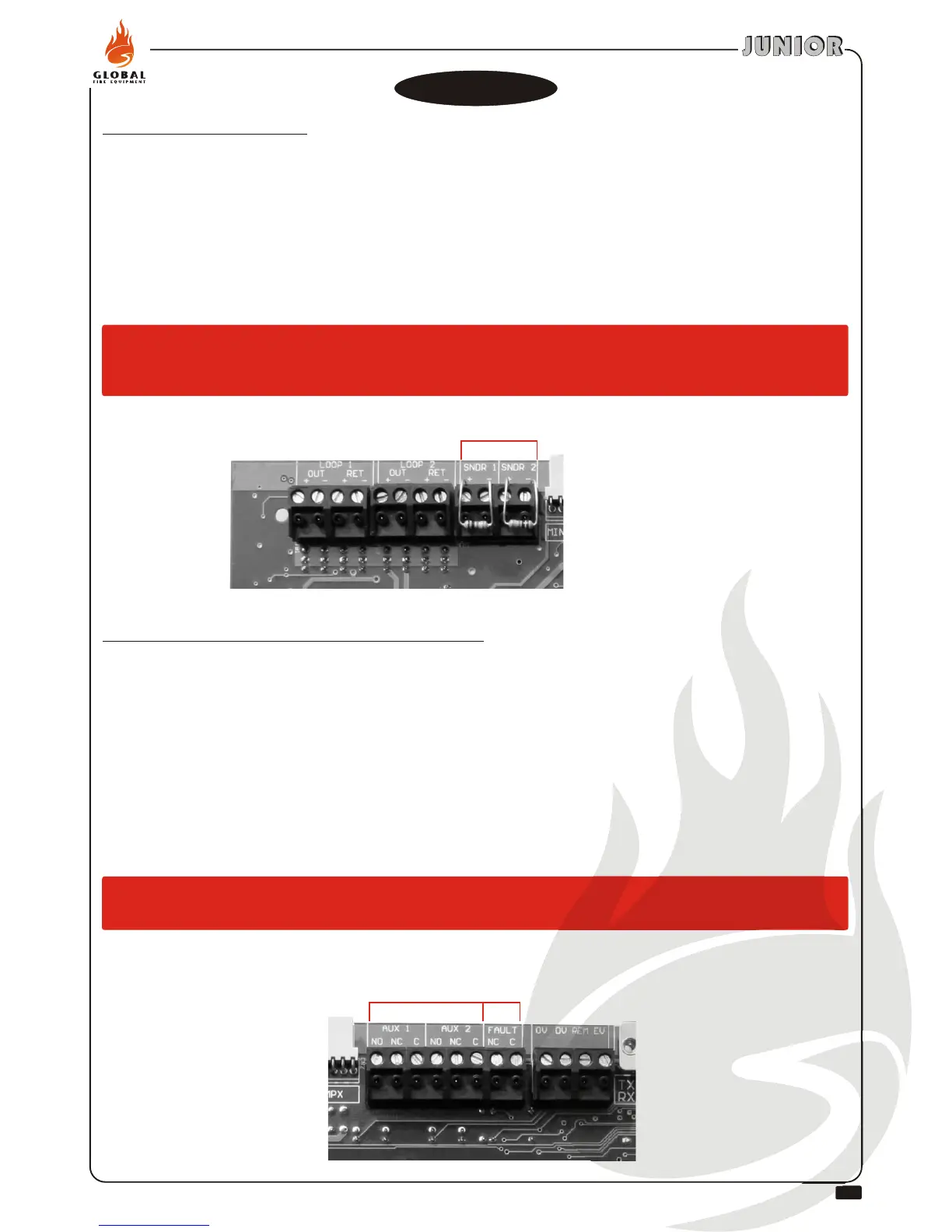 Two auxiliary fire relay outputs are provided on the JUNIOR Main board. These outputs are activated when a fire is