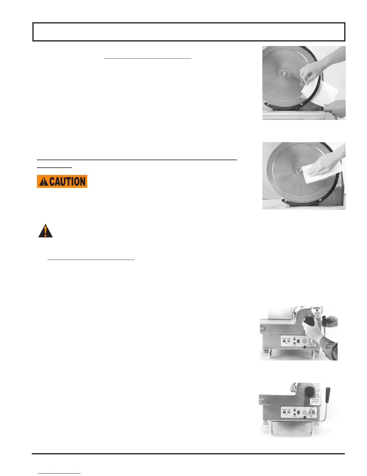 the slicer table off by starting at the knife and pulling towards you. Never wipe