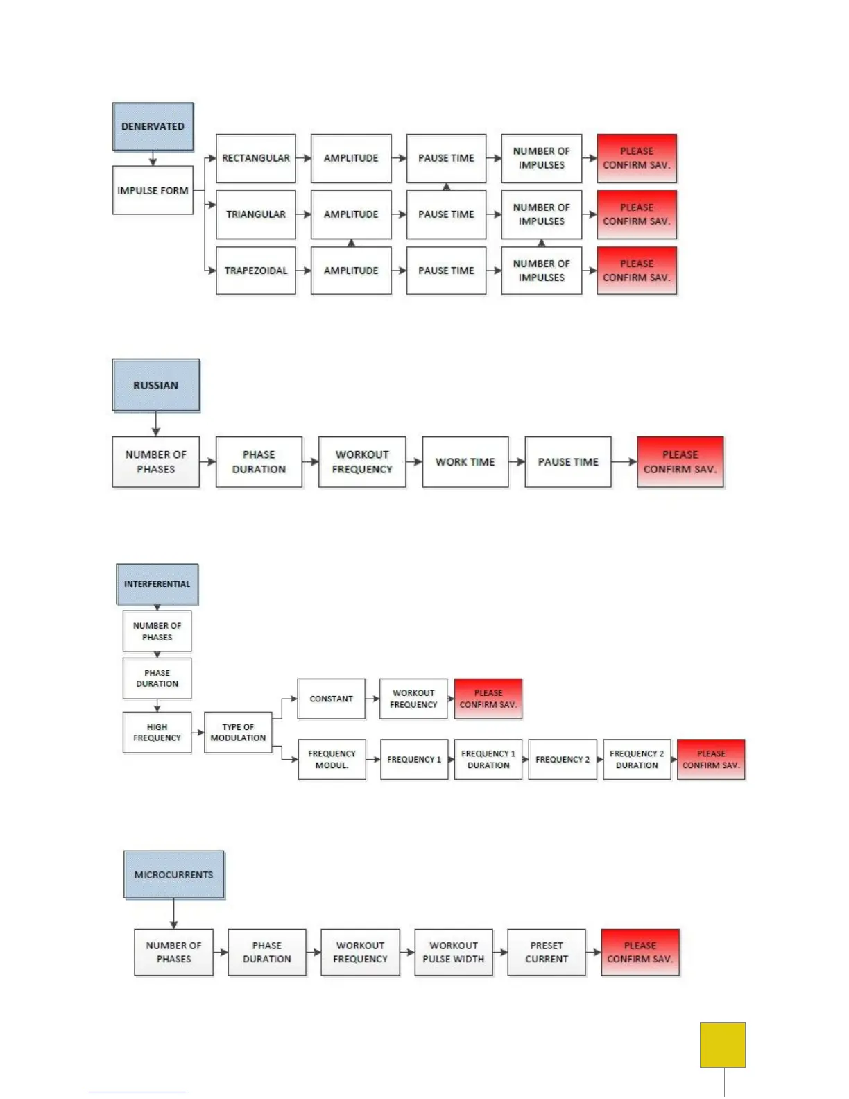 Globus the winner - Diagram of the Programming of the DENERVATED Currents; Diagram of the Programming of the KOTZ Currents; Diagram of the Programming of the INTERFERENTIAL Currents; Diagram of the Programming of the MICROCURRENT Currents