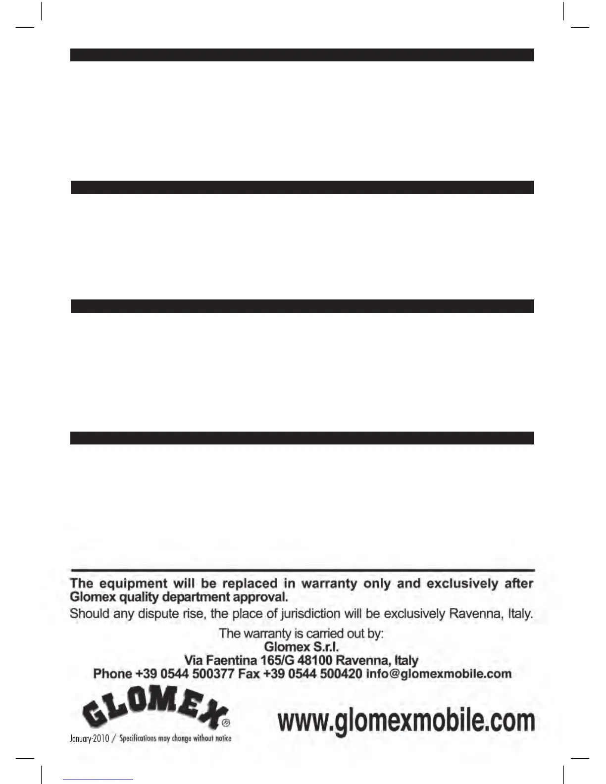 fabbricazione. Glomex non potrà in alcun caso essere ritenuta responsabile per danni subiti, per costi di installazione o per costi di altra natura relativi all’utilizzo del