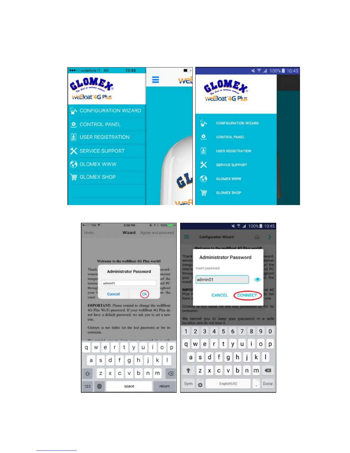 admin01, then press OK in the iOS version or press Connect in the Android