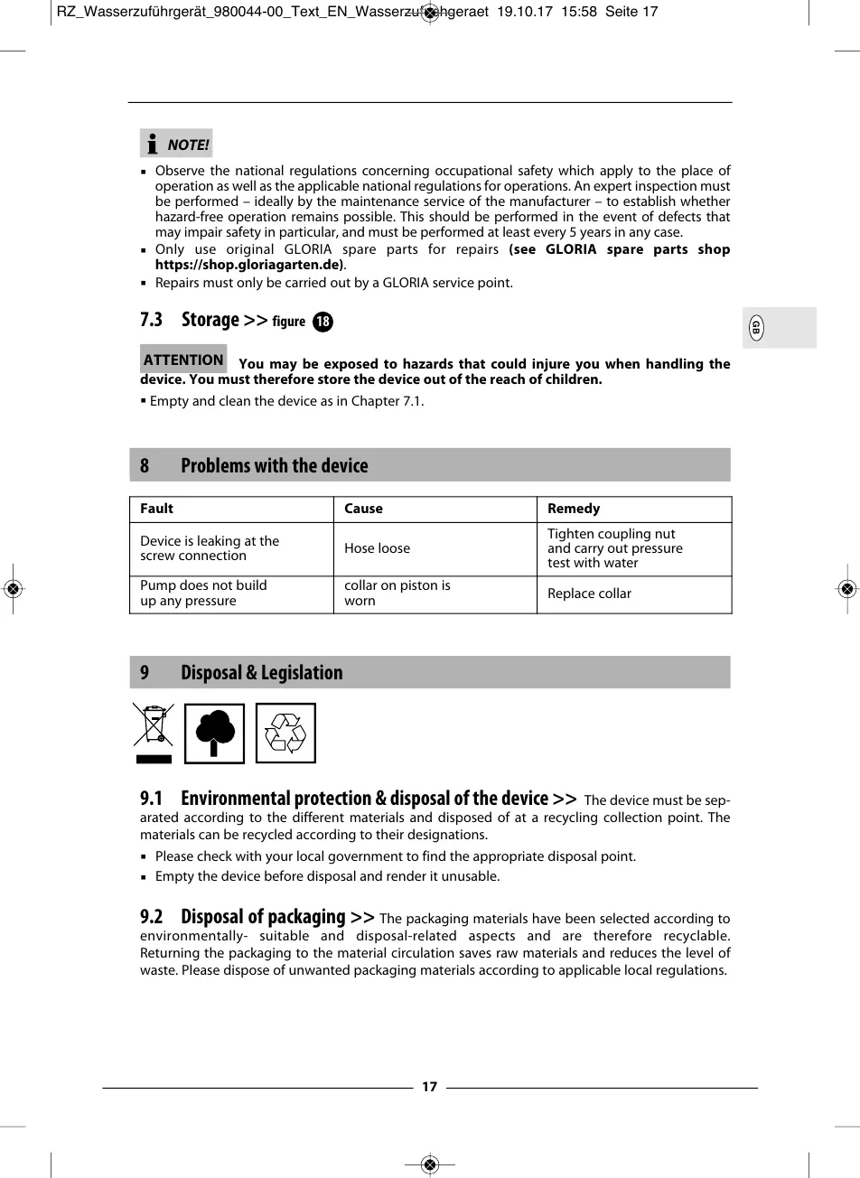 Only use original GLORIA spare parts for repairs (see GLORIA spare parts shop