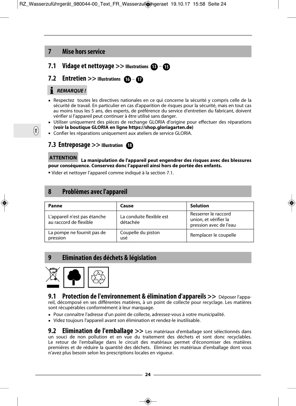 Utiliser uniquement des pièces de rechange GLORIA d’origine pour effectuer des réparations