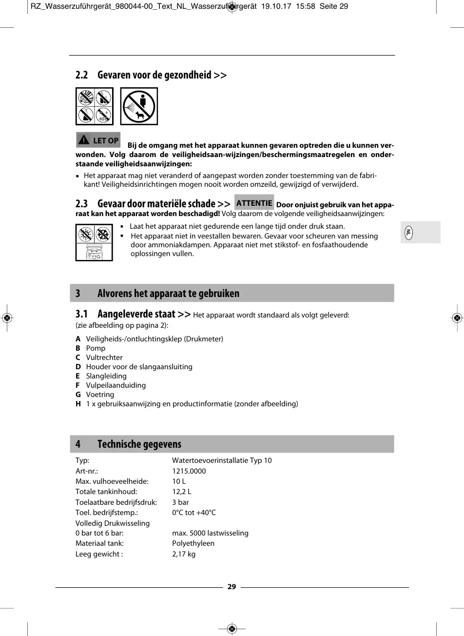 ! Het apparaat niet in veestallen bewaren. Gevaar voor scheuren van messing