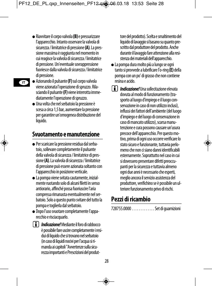 l Riavvitare il corpo valvola (B) e pressurizzare