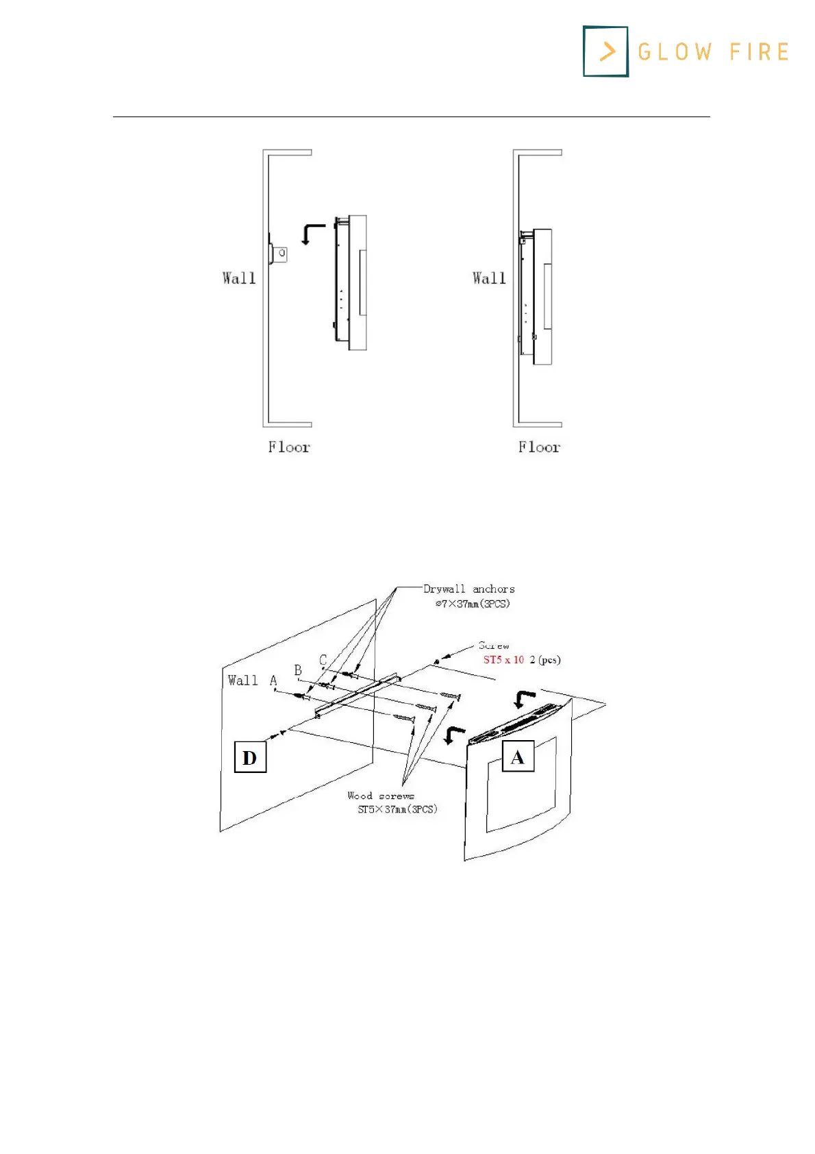 Przykręcić kominek do wspornika. Z dwoma śrubami ST5x10 (D) po obu stronach. Sprawdź