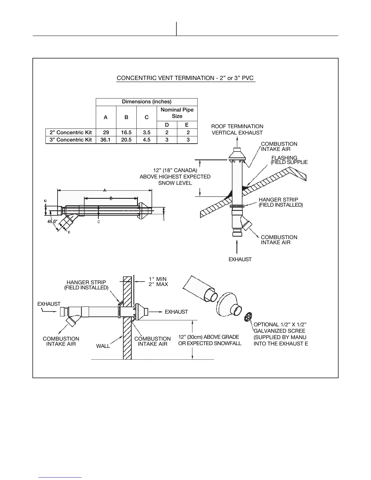 NOTE: USE ONLY ULC S636 APPROVED CONCENTRIC VENT TERMINATION - 2” or 3” PVC
