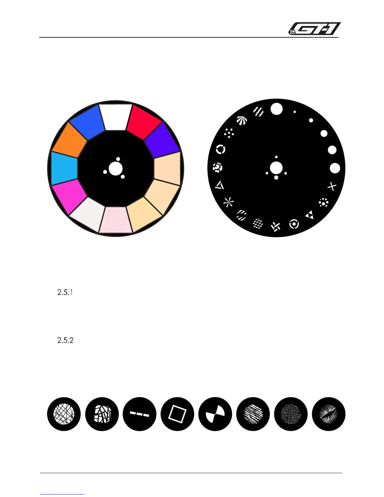 Gobo wheel 2 is an aluminum wheel with 19 patterns, including five iris gobos. The