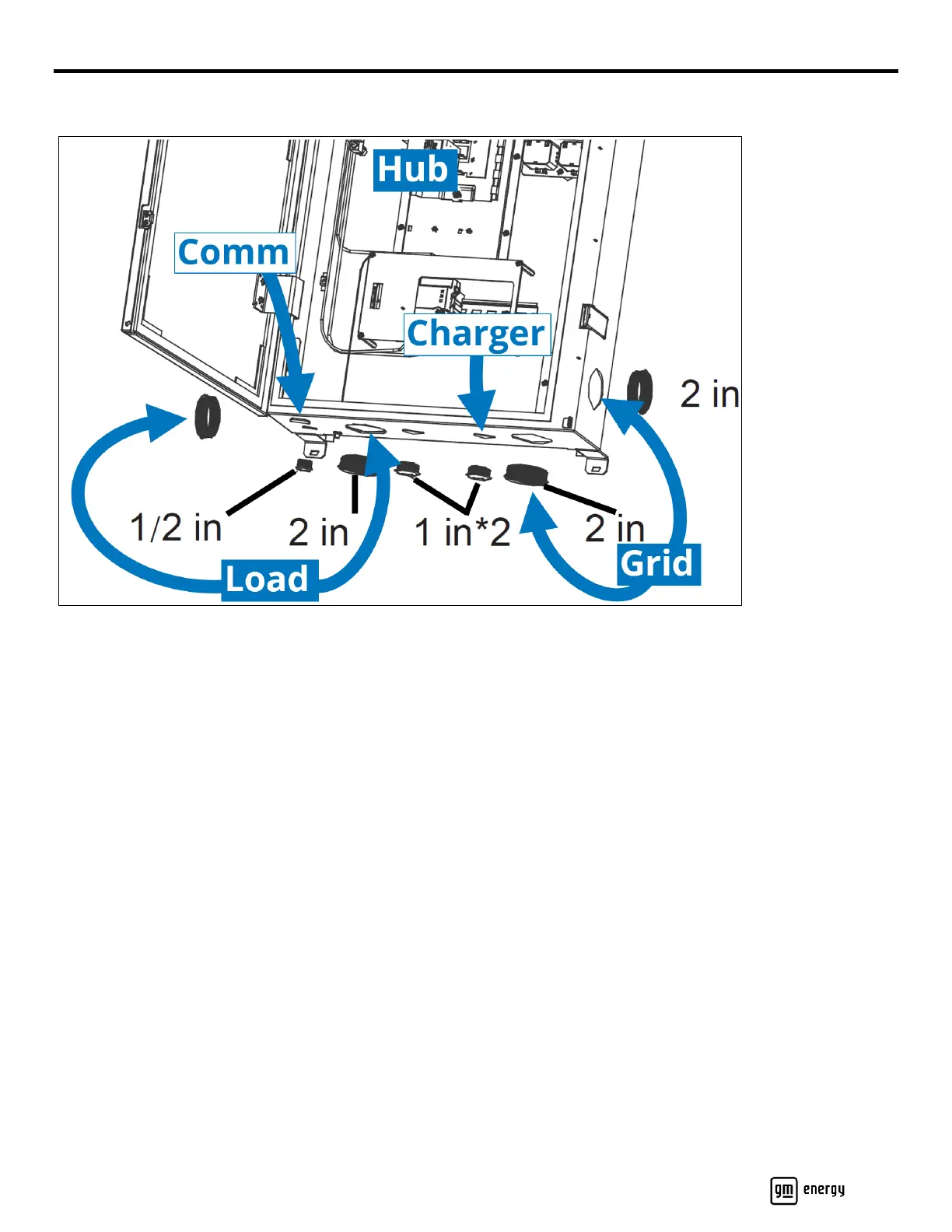 the right lower side. The left 1″ location is for the conduit coming from the Inverter. The left 1/2″ location is for the