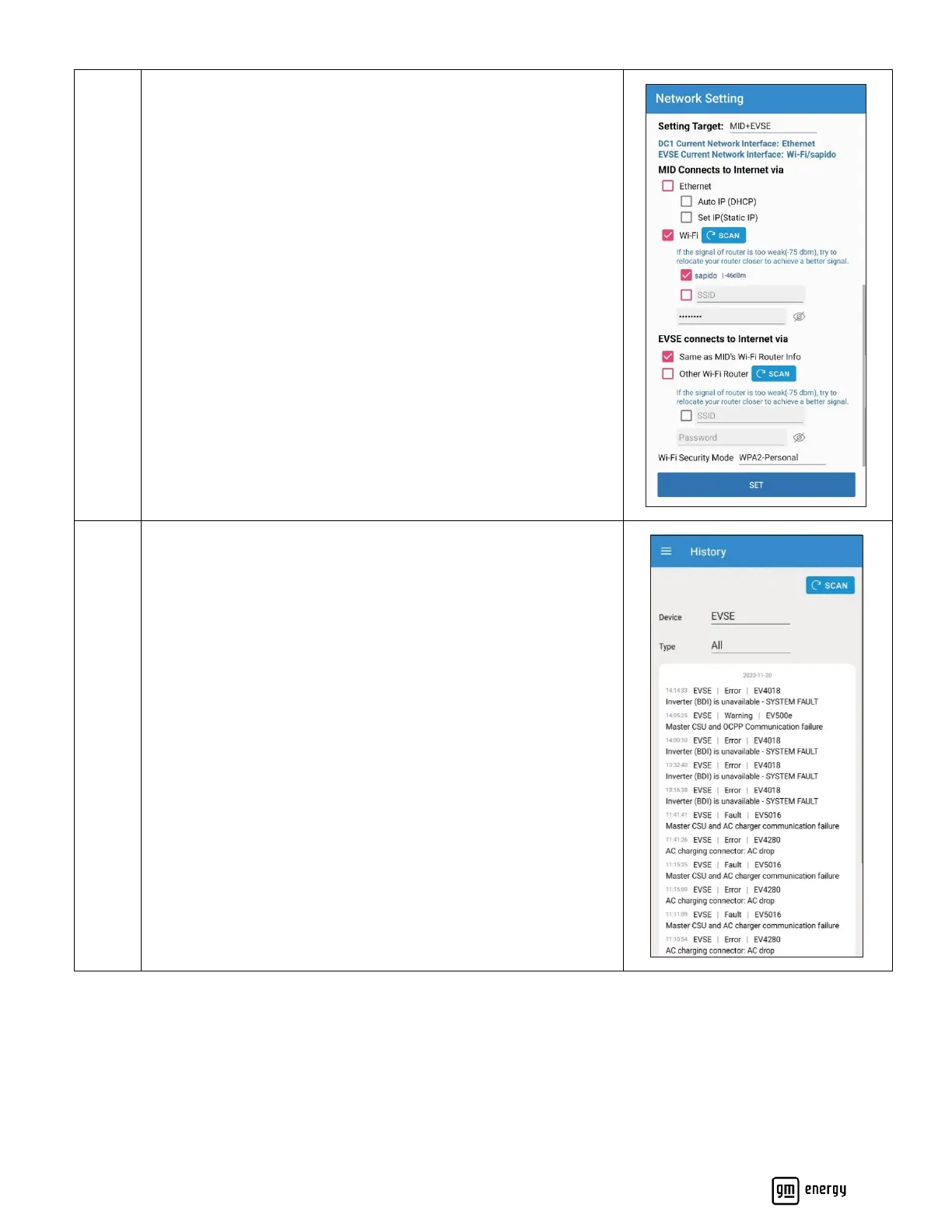 Show the event history by device or event type (Fault, Error,