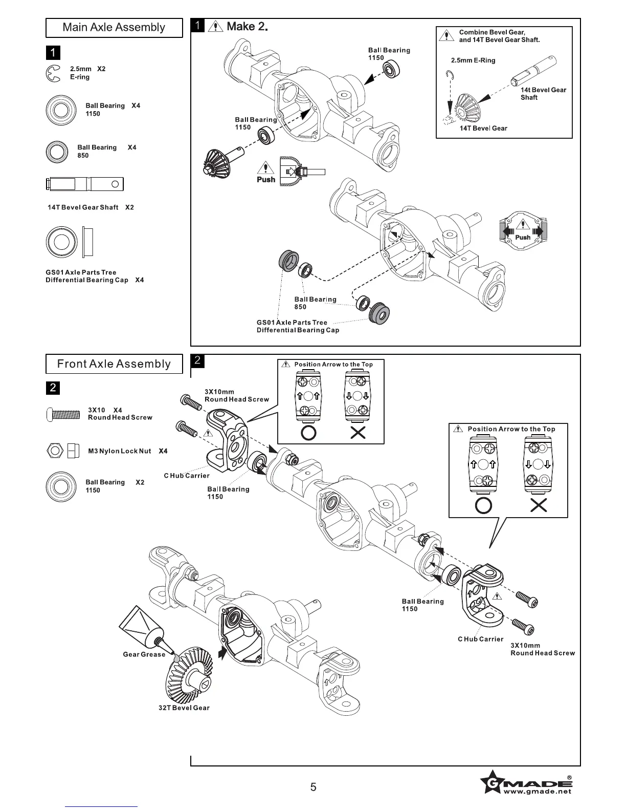Gmade SawBack - Main Axle Assembly; Differential Gear & Bearing Setup; Front Axle Assembly; C Hub Carrier & Gear Mounting