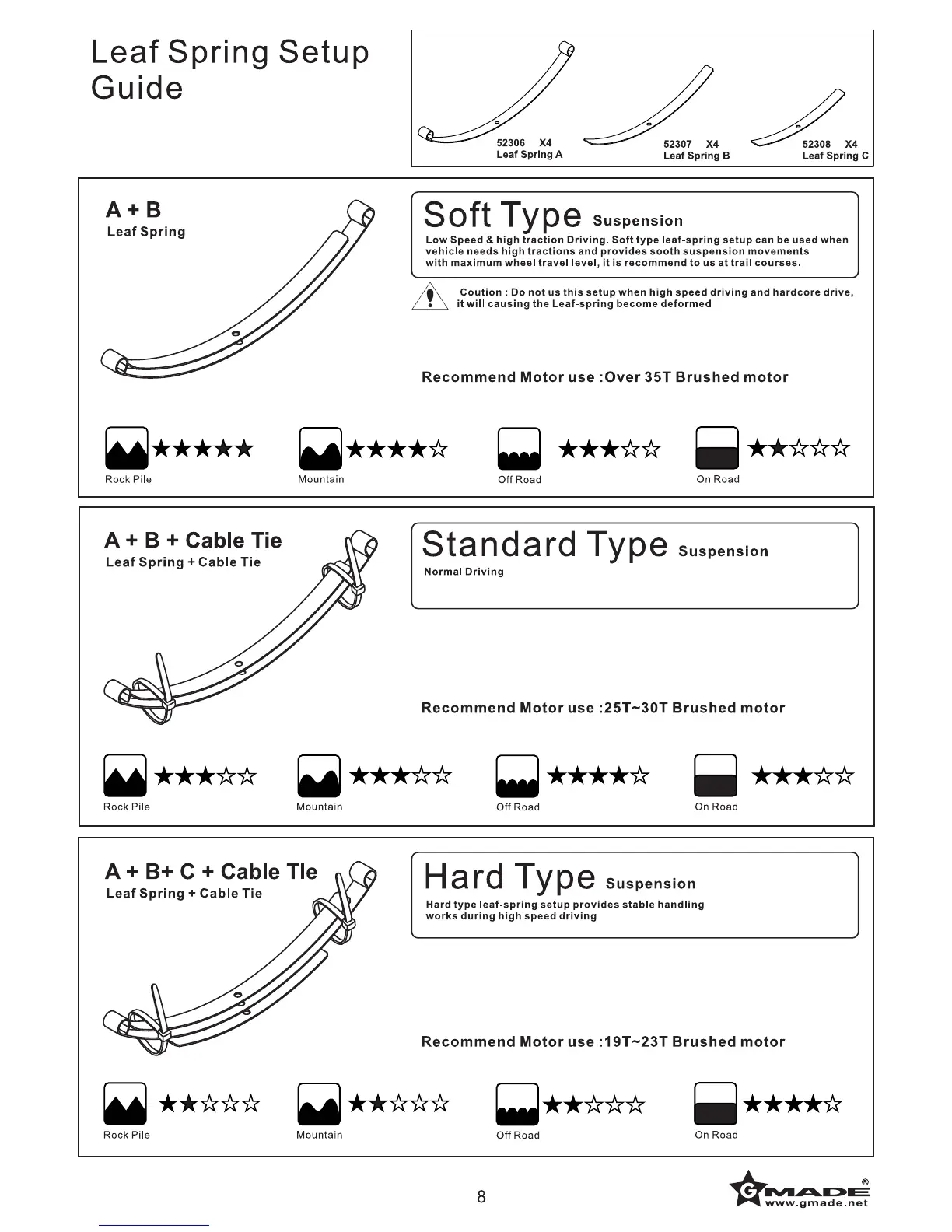 Gmade SawBack - Leaf Spring Setup Guide; Soft Type Suspension Setup; Standard Type Suspension Setup; Hard Type Suspension Setup