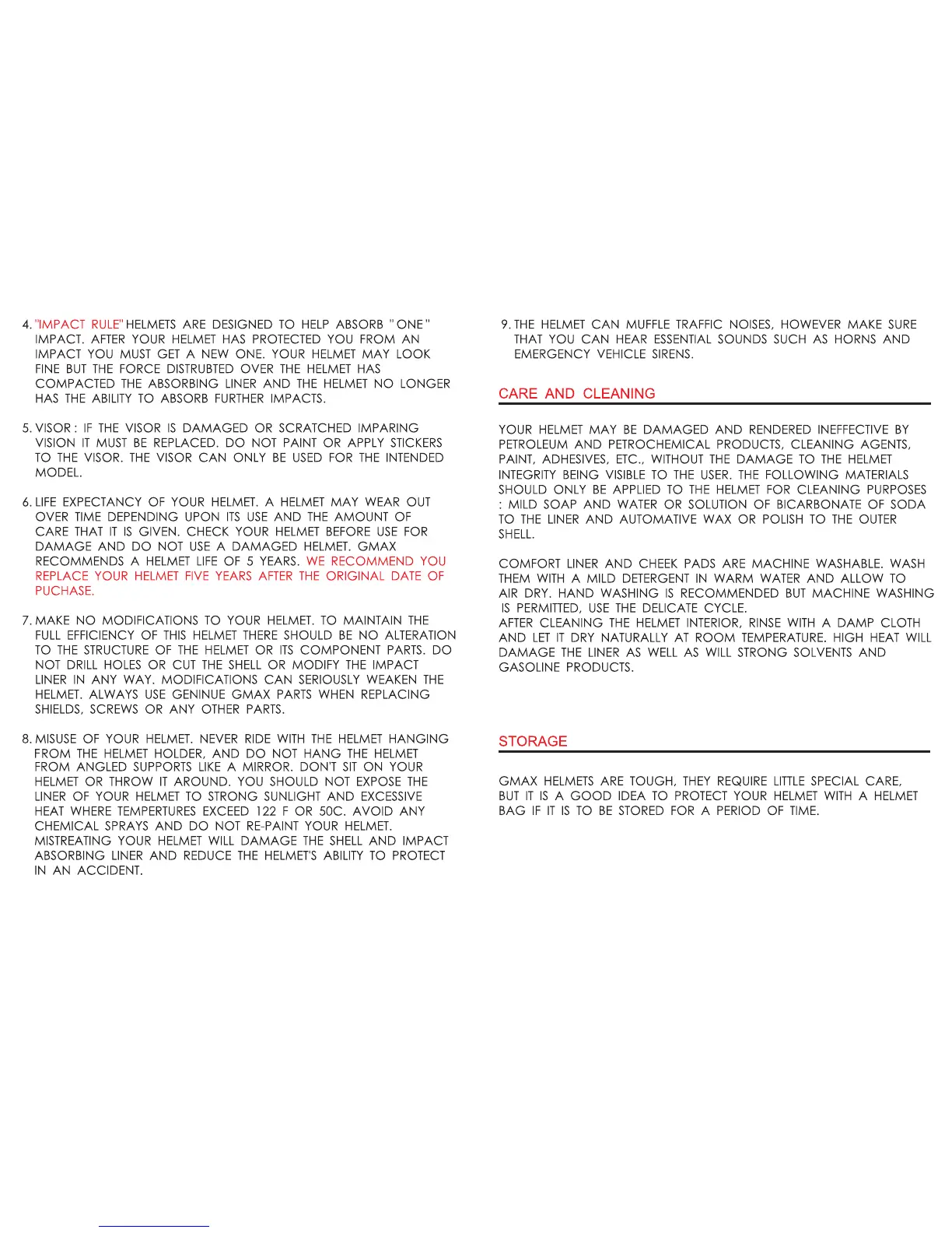 Gmax GM54S - Impact Protection and Lifespan; Preventing Damage and Misuse; Auditory Awareness and Care Overview; Helmet Care and Maintenance