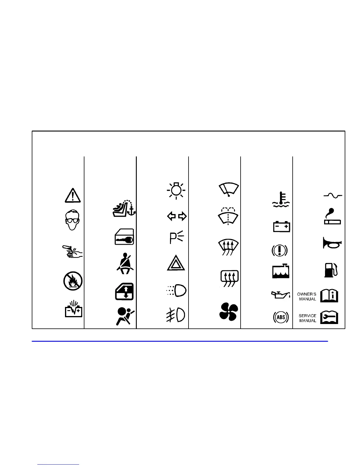 These are some of the symbols you may find on your vehicle. Also see “Warning Lights and Gages” in the Index.