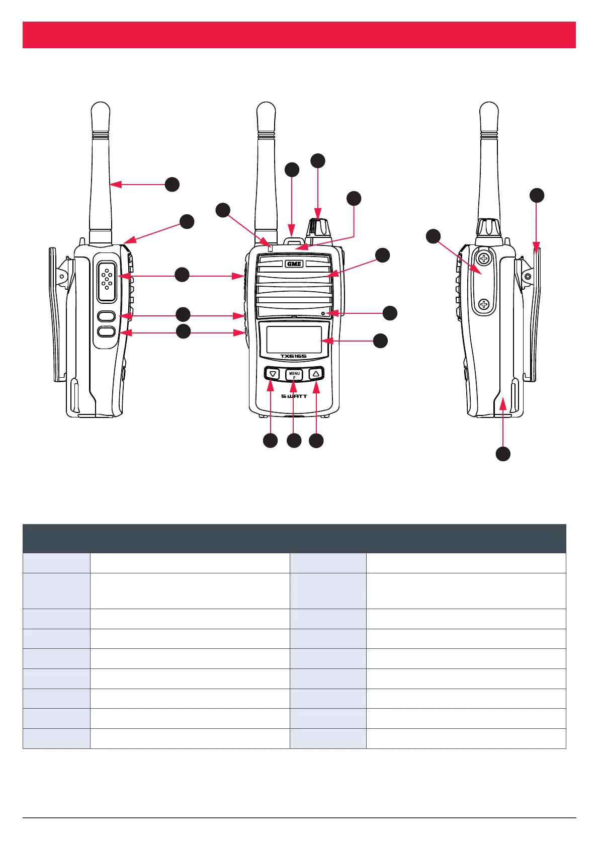 This section provides gures and a table that describes various parts of the TX6165 radio.
