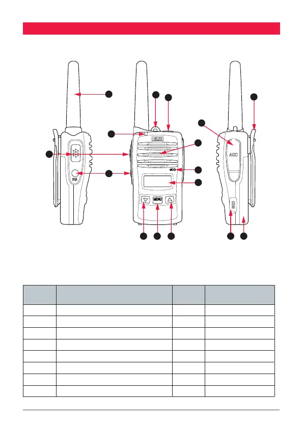The table that follows is a numbered description of the parts of the TX667 radio,