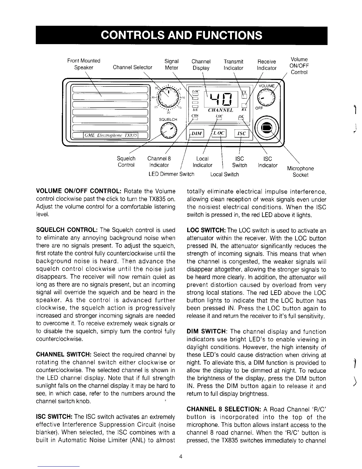 GME TX835 - Controls and Functions Overview; Volume ON;OFF Control; Squelch Control; Channel Switch
